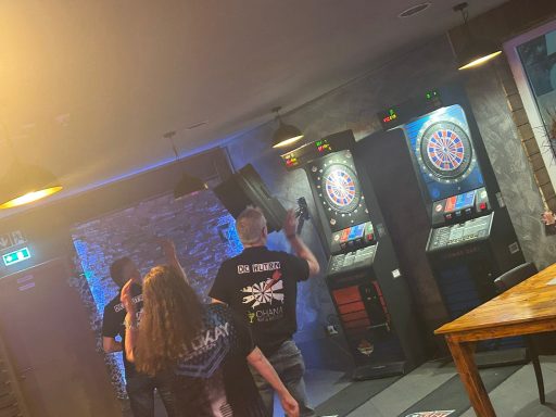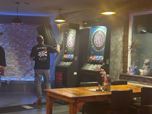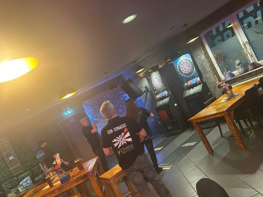 Eine Stunde später ging es los. Nach der Begrüßung begannen wir mit Jörga und Thomas im ersten Doppel, was wir mit 2:0 legs gewinnen konnten.